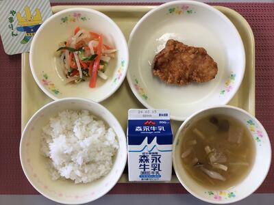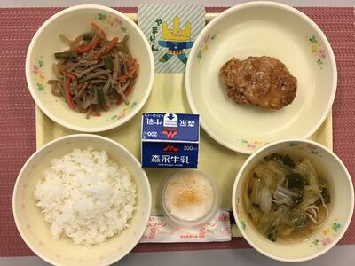 ごはん、牛乳、鶏の唐揚げ、かみかみサラダ、白菜のみそ汁
