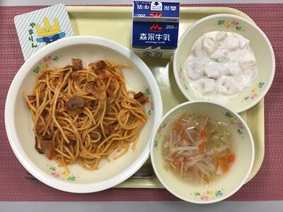 〈献立名〉 スパゲティミートソース 牛乳 フルーツヨーグルト和え コロコロ野菜スープ