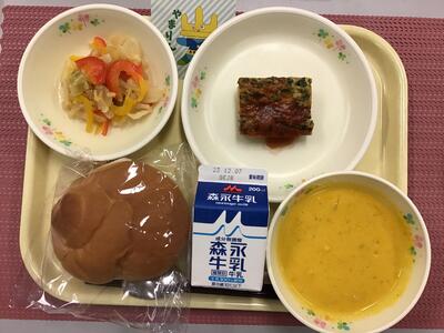 ミルクパン,牛乳,かぼちゃコロッケ,ペンネのミートソースソテー,春野菜のポトフ