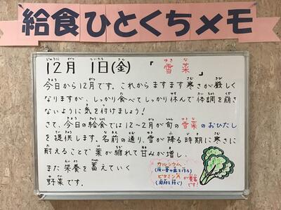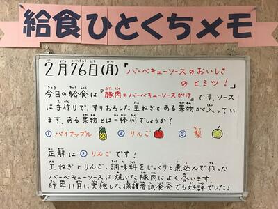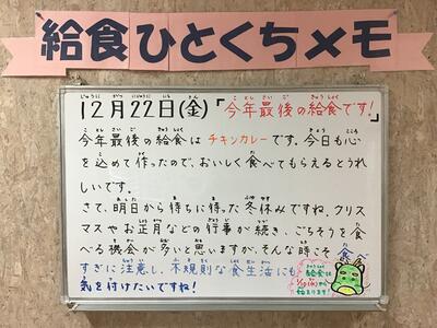 今年度の給食ブログは今回が最後になります。これまで見てくださったみなさん,本当にどうもありがとうございました。本校で児童生徒のみなさんが食べている給食や給食ひとくちメモを知っていただくことで,それが家族団らんの話題や食育につながったとすればこんなに嬉しいことはありません。来年度も定期的にブログを更新する予定ですので,引き続きご覧いただければ幸いです。