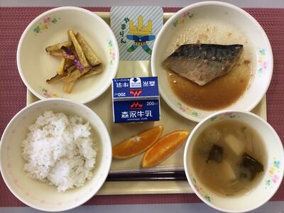 ごはん、牛乳、さばの味噌煮、ほうれんそうののり酢和え、沢煮椀、山元町産りんご