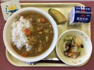 ドライカレー(麦ごはん)、牛乳、豆と野菜のスープ、バナナ
