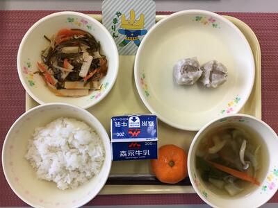 ごはん,牛乳,えびしゅうまい,切り干し大根のナムル,わかめスープ,デコポン