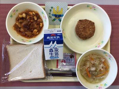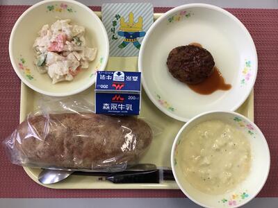 きなこ揚げパン、牛乳(コーヒー牛乳の素)、ハンバーグケチャップソースがけ、ツナポテサラダ、コーンポタージュ