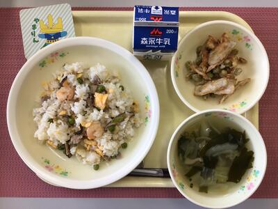 五目チャーハン、牛乳、ごぼうの甘辛揚げ、わかめスープ