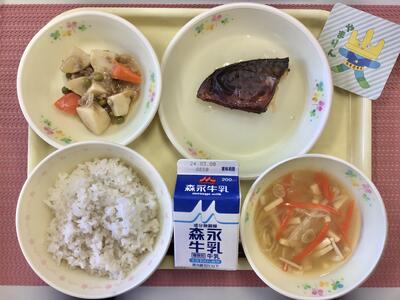 麦ごはん、牛乳、さばの塩糀焼き、里芋のそぼろ煮、ひきな汁