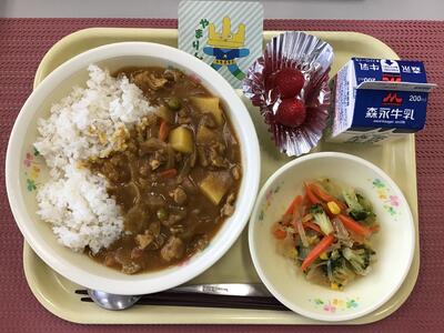 ポークカレー(麦ごはん)、牛乳、ブロッコリーソテー、いちご