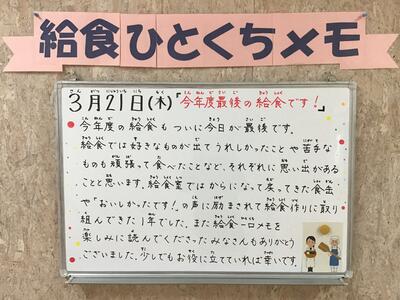 今年度の給食ブログは今回が最後になります。本校で児童生徒のみなさんが食べている給食や給食ひとくちメモを知っていただくことで、それが家族団らんの話題や食育につながったとすればこんなにうれしいことはありません。これまで見てくださったみなさん、本当にどうもありがとうございました。