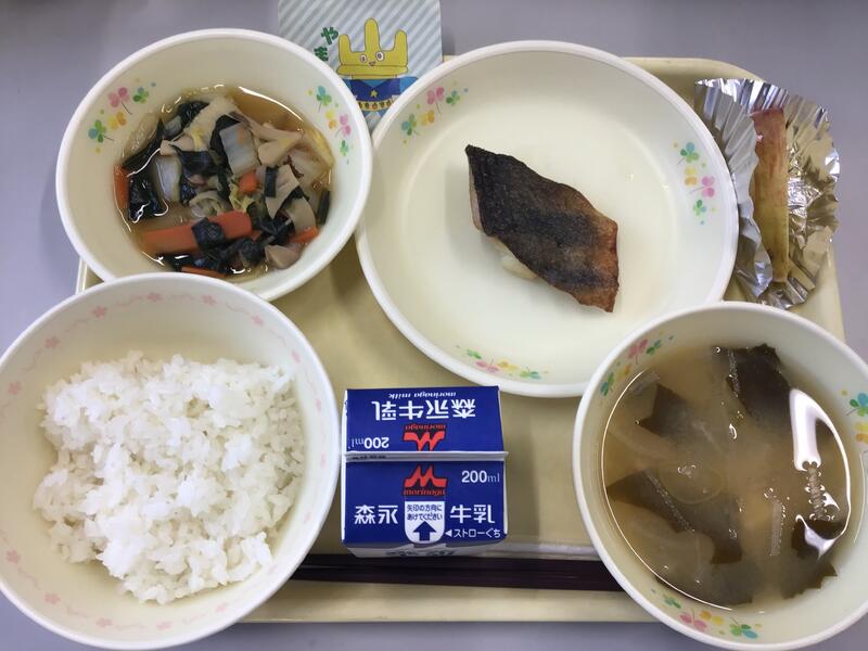 〈献立名〉ごはん 牛乳 ほっけの塩焼き 白菜とエリンギの煮浸し 豆腐と大根のみそ汁 りんご