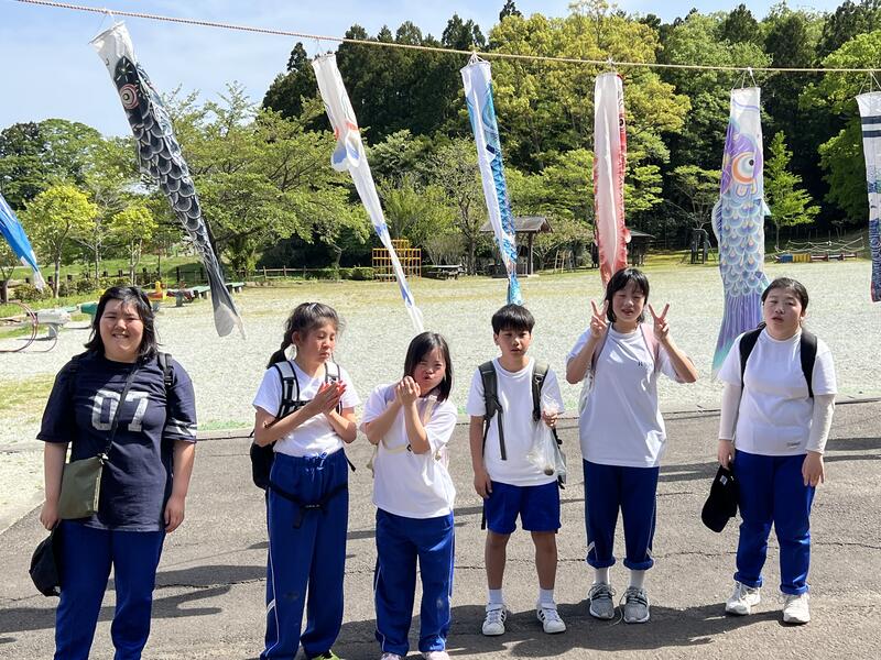 深山山麓少年の森「菱沼の郷」の鯉のぼりを背景に集合写真を撮りました。