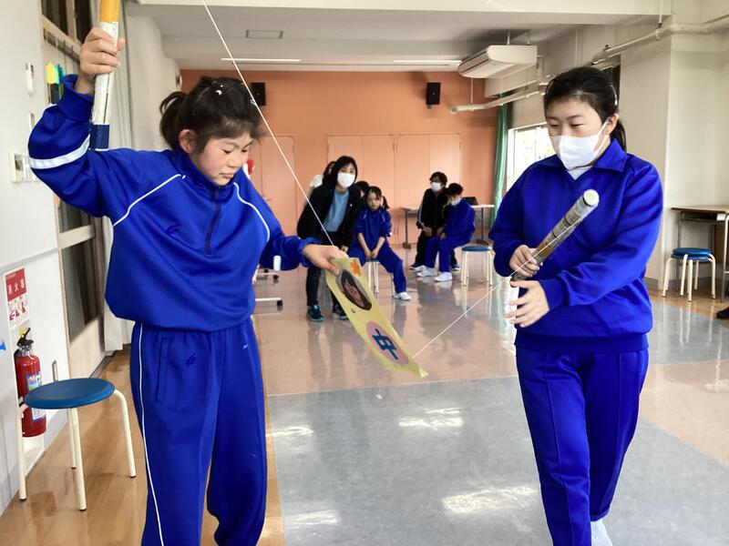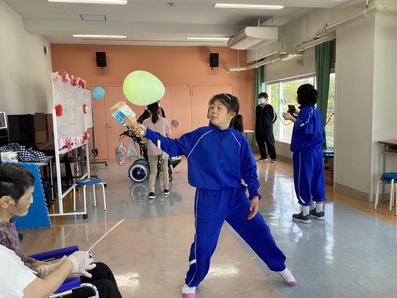 2つのグループに分かれて、風船羽子板を楽しみました。