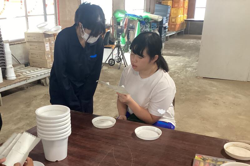 7月18日(木)にひまわり教室高等部の1、2年生と亘理高校の交流会を行いました。今年は枝豆の収穫とひまわりの鉢上げを行いました。亘理高校の生徒の皆さんに一つ一つ丁寧に教えていただきました。