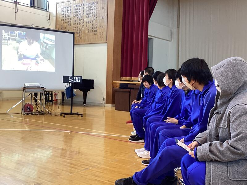 2月22日に卒業生を送る会を行いました。卒業する3年生に楽しんでもらうために、1、2年生が中心となって会の準備、運営を行いました。卒業生の3年間をまとめたスライドショーを見たり、レクリエーション大会をしたりして、参加した全員で楽しい時間を過ごすことができました。