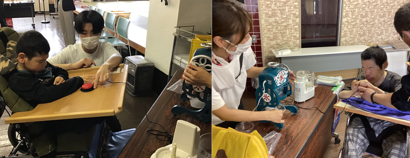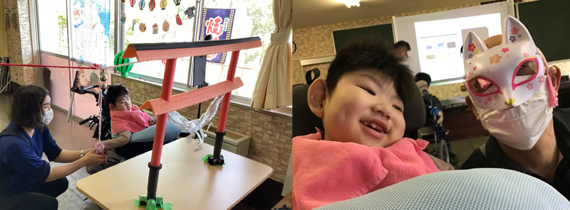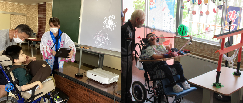 夏休み前のお楽しみ、今回のあすなろ集会は「夏祭り」が行われました。かき氷とオモチャ流しの屋台を回ったり、タブレット端末の画面をタッチして花火を打ち上げたり、夏詣での風車と風鈴で涼を感じたりして「夏祭り」を楽しみました。