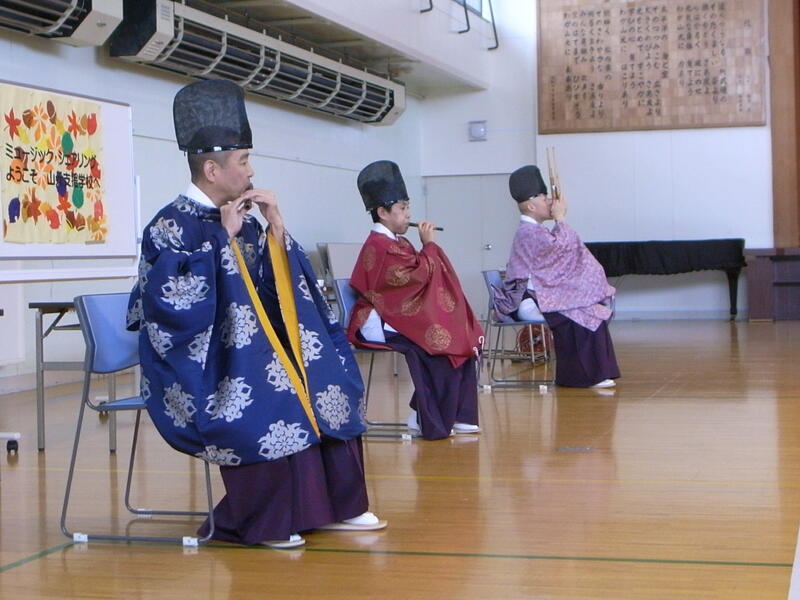 【小学部の発表】音楽に合わせて楽器を叩いています。