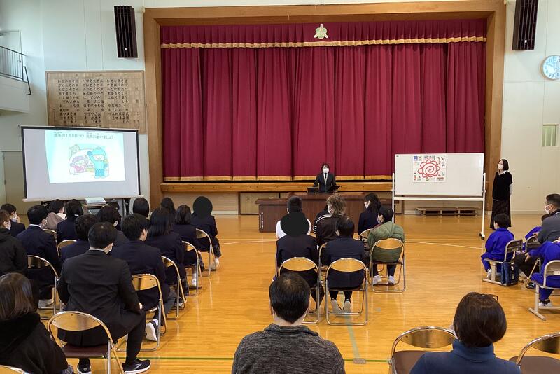 12月20日(金)に冬休み前の全校集会を行いました。校長先生の話のあと、「宮城県造形教育作品展」について入選した生徒へ表彰を行いました。次に冬休みの過ごし方について話を聞きました。また、全校集会終了後、「栄養士さん調理員さんに感謝する会」を行いました。毎日給食のメニューを考え、調理してくれている栄養士さん、調理員さんに日頃の感謝を伝えるメッセージカードとプレゼントの贈呈を行いました。