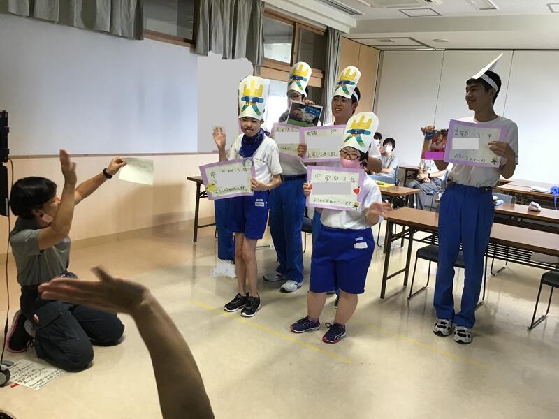 時間をずらし、あすなろ教室の全校集会を宮城病院デイケア棟で行いました。久しぶりに同級生や先生と再会し、笑みがこぼれる児童生徒でした。