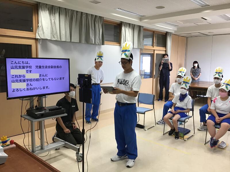 2回目の交流内容は学校紹介です。角田支援学校からはクイズ形式で学校の様子が紹介されました。毎朝5~8km走っていることに衝撃を受け,驚きの声が上がりました。本校のマスコットキャラクター「やまりん」を紹介すると,相手校のキャラクターの紹介があり,またお互いの作業製品の紹介をすると,「交換しましょう!」と約束をするなど,とても盛り上がりました。