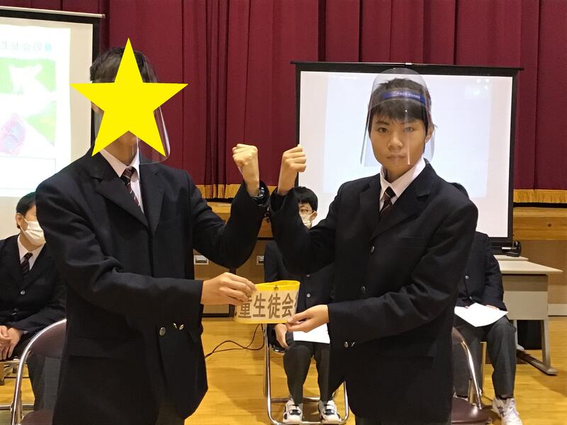 現生徒会長から新生徒会長へ,しっかりたすきが渡されました。