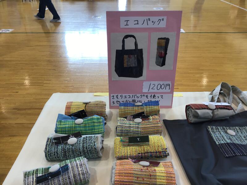 【高等部の販売】クラフト班。さをり織りで製作した布を加工してエコバッグにしました。