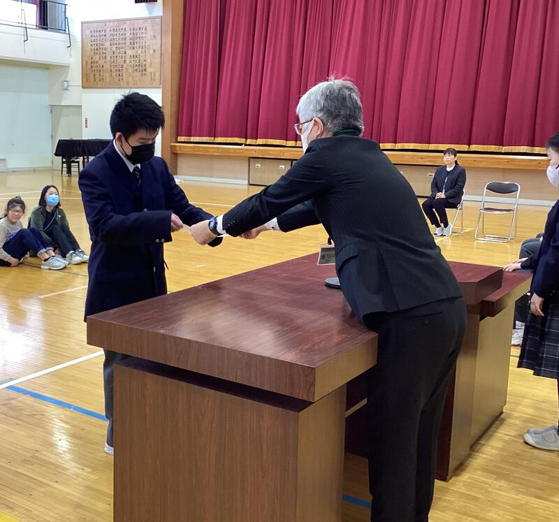 12月3日(火)に、前生徒会役員から新生徒会役員への引き継ぎ式を行いました。始めに、新生徒会役員の呼名と任命証が授与され、次に新生徒会長から挨拶がありました。その後前生徒会長から挨拶を行い、腕章の引き継ぎを行いました。最後に新・前生徒会役員全員の集合写真を撮りました。