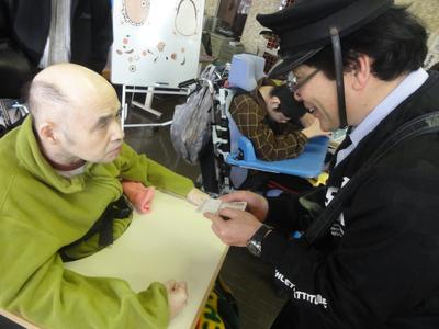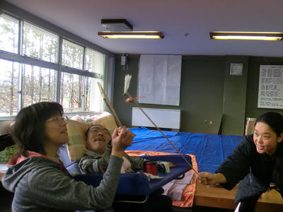 1月10日(金)宮城病院内デールームにて「お正月の行事を知ろう」の授業を行いました。郵便配達員に扮した教員から年賀状を受け取った後,正月にちなんだ福笑いや羽子板遊びを楽しんだり,書き初めや絵馬書きをしました。神社参拝では手作りの鳥居を設置し、神主に扮した職員からお祓いを受けました。また獅子舞が登場し、一人ずつ生徒の頭を噛んでもらい,今年一年の無病息災を願いました。2020年もあすなろ教室をよろしくお願いします。