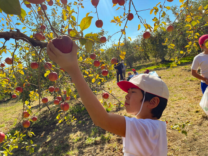 りんご園の山田さんにりんごの扱い方を教わり、いよいよりんごをもぎとります。慎重に両手でそっととる子もいれば、慣れた手つきでとる子もいました。りんごがとれた瞬間には歓声、そして笑顔が見られました。
