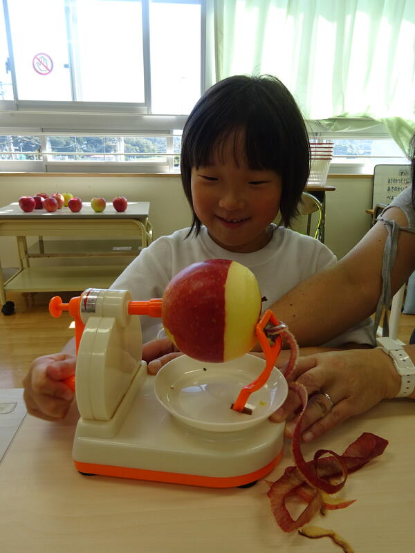 学校に戻り、昼食後には道具を使って一人ずつりんごの皮むきを体験しました。むいた後はもちろん試食です。とれたてのりんごはとてもフレッシュ。教室には笑顔と爽やかなりんごの香りが広がりました。