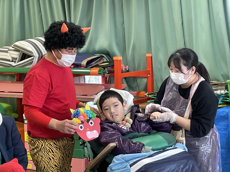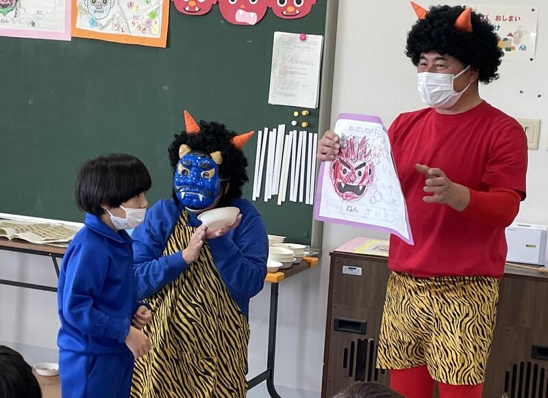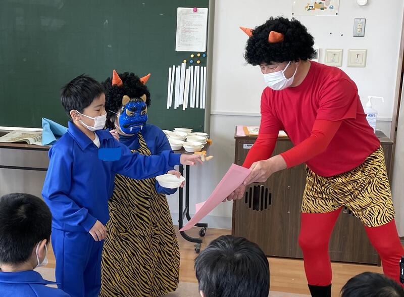 2月2日(金)に小学部で豆まき会がありました。今回はあすなろ学級のお友達も参加でき、みんなで楽しく豆まきを行いました。赤鬼さん、青鬼さんが来てくれました。