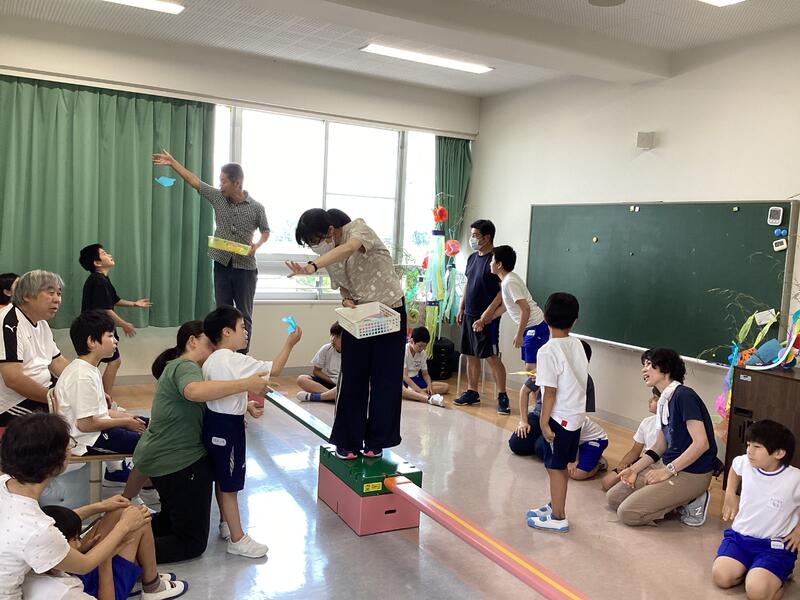 「お星様をつかまえよう」のゲームでは、ひらひら舞い落ちるお星様をキャッチ!みんな笑顔で取り組んでいました。