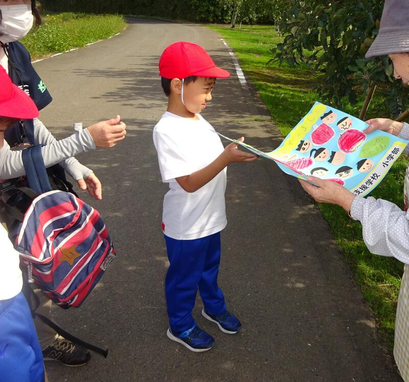 後日、みんなで制作したお礼状を届けに行きました。りんご園の方がとても喜んでくださいました。