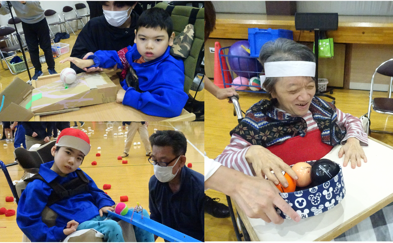 それぞれの方法で玉入れ競技に参加しました。「見てて!入れるよ!」
