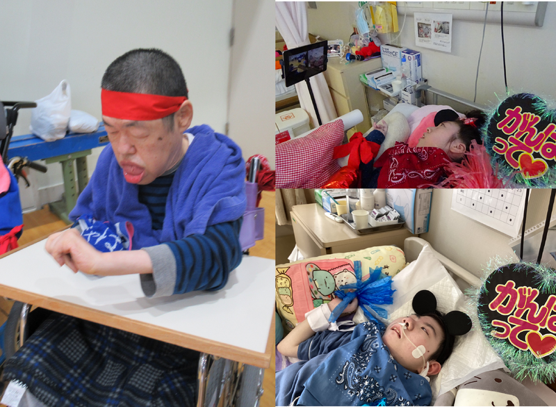 ファイティングポーズで気合いの応援「頑張れ!」 病棟からもオンラインで応援です。