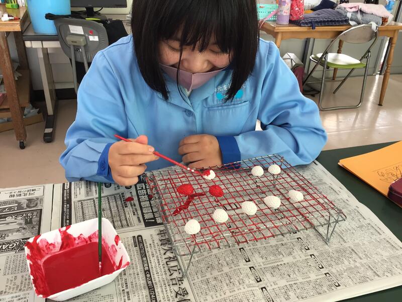 農業班② 野菜以外にも小物製品を作っています。(苺の形のマグネットやキーホルダー作り)