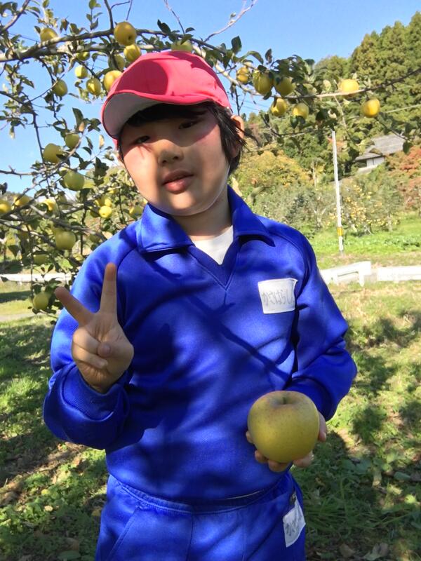 11月5日,秋晴れの空の下,「りんご狩り」に行ってきました。毎年お世話になっている山田りんご園では,赤いりんごや黄色いりんごがきれいにたくさん実っていました。山田さんにりんごの採り方を教えてもらい,子どもたちは,「どれにしようかな?」と選びながら,上手にりんごを採ることができました。