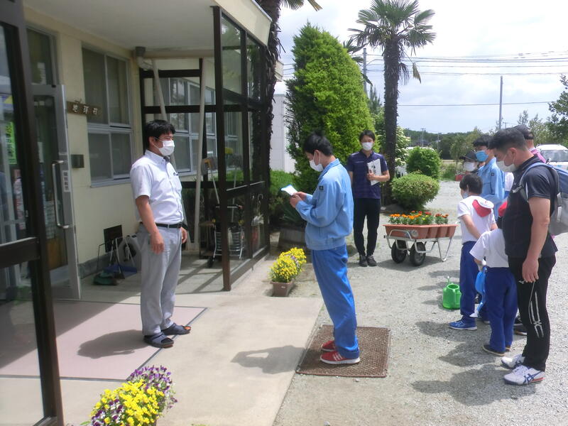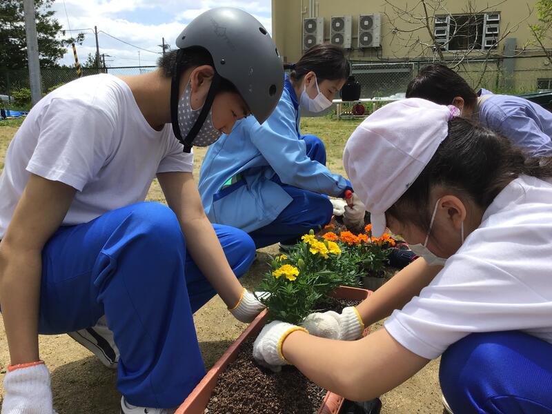 5月25日(火)今年度初めての花いっぱい運動(植栽作業)を行いました。小学部から高等部の児童生徒が縦割りで4つのグループに分かれ,プランターにマリーゴールドを植えました。高等部生徒が小中学部の児童生徒に植え方を教えたり,サポートしたりと,異年齢の交流はどの学部の児童生徒にとっても有意義な時間となりました。プランターは,学校周辺の宮城病院,第二みやま荘,地球村・清和園,桜塚集会所に置かせていただきました。地域の方々にそれぞれの場所の花をみて,温かい気持ちになってもらいたいと思います。今後は児童生徒が交代で水やりなどの管理を行います。