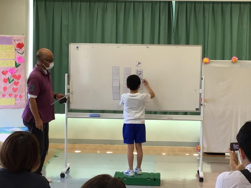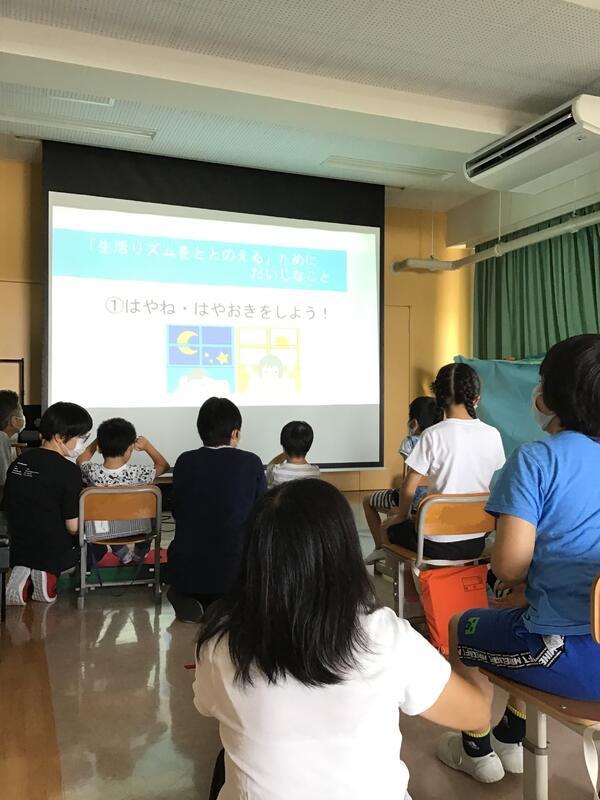 ひまわり教室は体育館で,校長先生から写真を見ながら4月からの学習の振り返りや夏休みの過ごし方についての話があり,集中して聞いている様子が見られました。その後教室に戻り,夏休みに気をつけることを動画で確認しました。