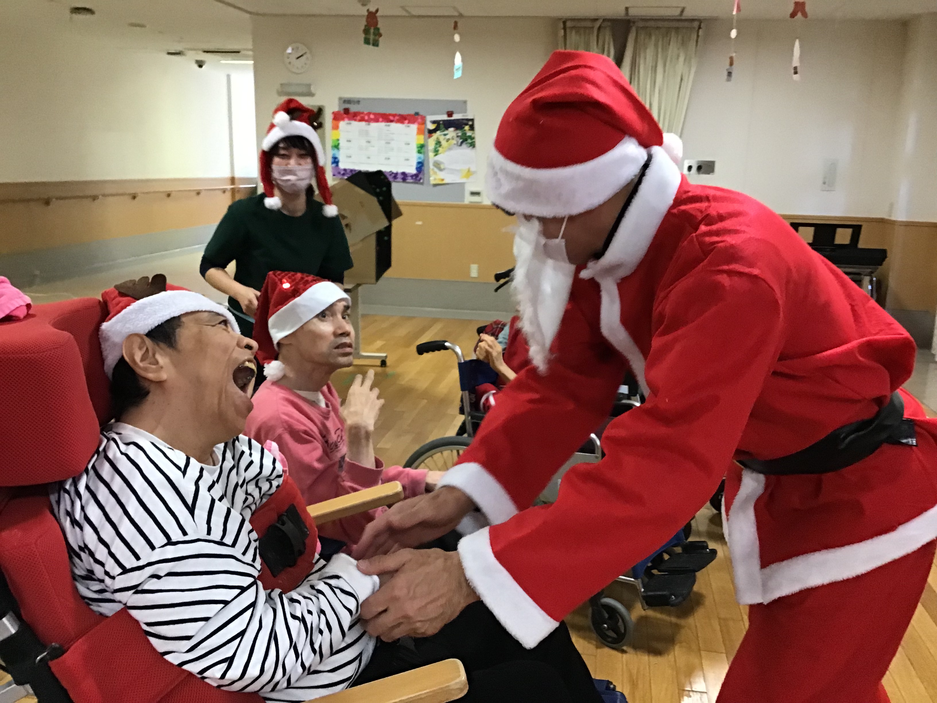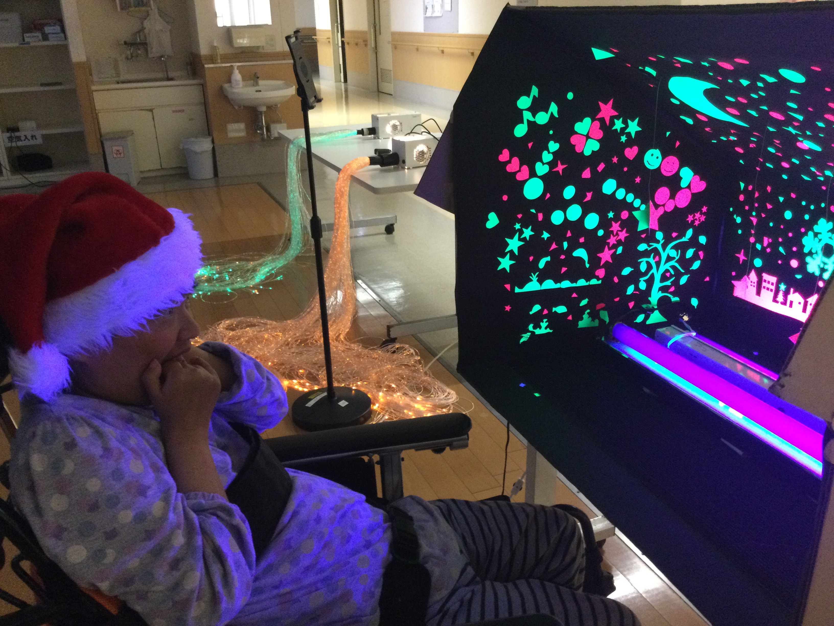 今月は1病棟,2病棟それぞれで全員が集まり,クリスマス会を行うことができました。いつも2人ずつ授業を行っていたので,4人全員で集まって授業ができたのは今年度初めてです。少し暗くしてイルミネーションを見たり,ツリーやリースに飾り付けをしたり,クリスマスの歌を演奏したりと各病棟でいろいろな活動を楽しみました。