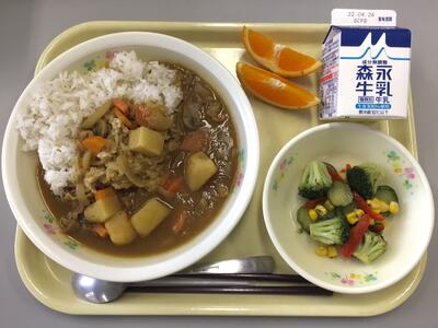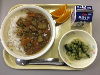 ポークカレー(麦ごはん),牛乳,ブロッコリーサラダ,清見オレンジ