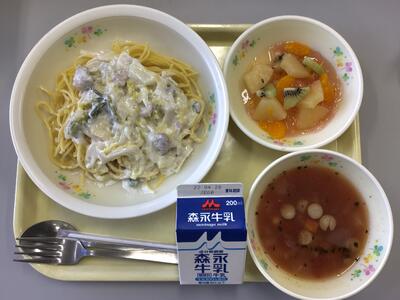 春キャベツのクリームスパゲティ,牛乳,豆と野菜のトマトスープ,アセロラゼリー和え