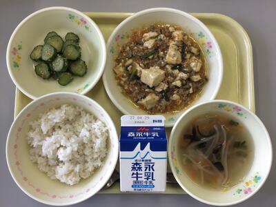 麦ごはん,牛乳,麻婆豆腐,ごまきゅうり漬け,もやしのスープ