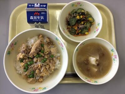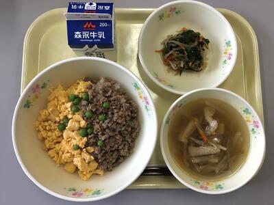 二色そぼろ丼(ごはん),牛乳,もやしとにらのおひたし,沢煮椀