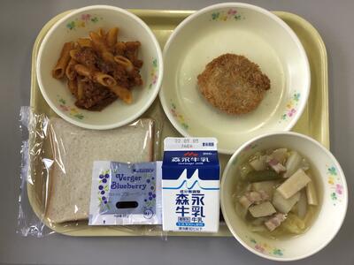 食パン(ブルーベリージャム),牛乳,かぼちゃコロッケ,ペンネのミートソースソテー,春野菜のポトフ