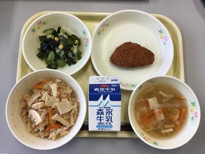 たけのこごはん,牛乳,かつおフライ,わかめ入り和風サラダ,ひきな汁