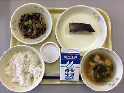 麦ごはん,牛乳,さわらのみそ焼き,かぼちゃのそぼろ煮,手作りはっと汁