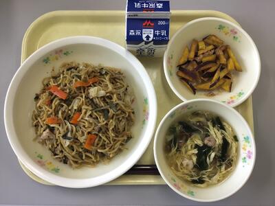 にら入りソース焼きそば,牛乳,さつまいもスティック,えびとなめこの卵スープ