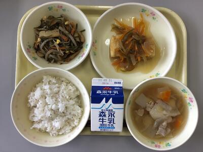 ごまごはん,牛乳,揚げ出し豆腐の野菜あんかけ,すき昆布の炒り煮,豚汁