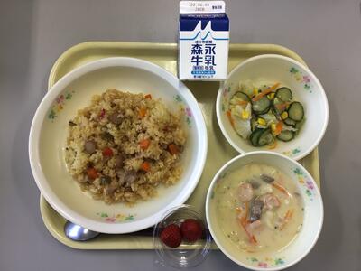 ジャンバラヤ,牛乳,コールスローサラダ,マカロニクリームスープ,いちご
