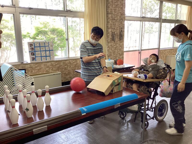 夏休み前のお楽しみとして、病棟ごとにあすなろ集会が行われました。1病棟ではボーリング大会!それぞれ得意を活かした方法で投球し、ピンが倒れると歓声が上がっていました。