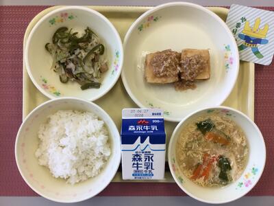 ごはん、牛乳、揚げ出し豆腐の肉みそがけ、キャベツの塩昆布炒め、かんぴょうの卵とじ